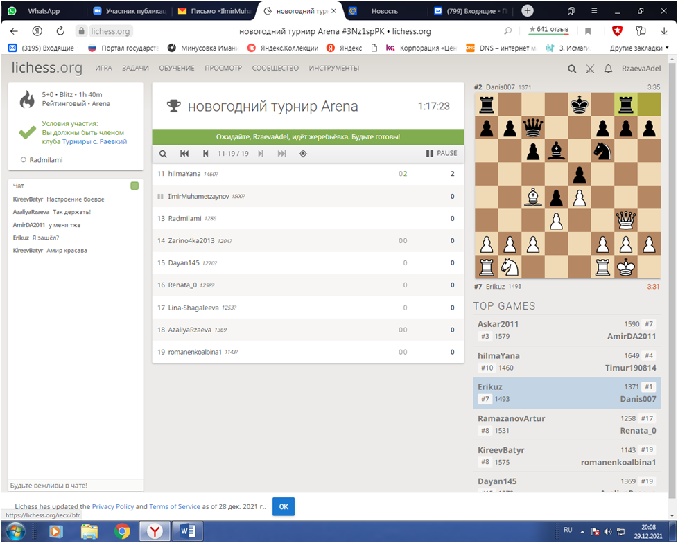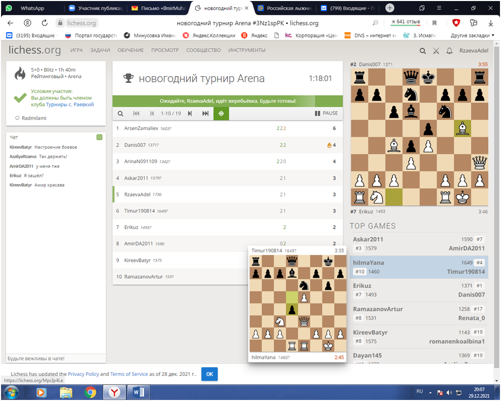 29 декабря 2021 года в преддверии празднования Нового года МБУДО ДЮСШ с. Раевский совместно с Комитетом по спорту и молодежной политике Альшеевского района провели онлайн блиц-турнир по шахматам.
