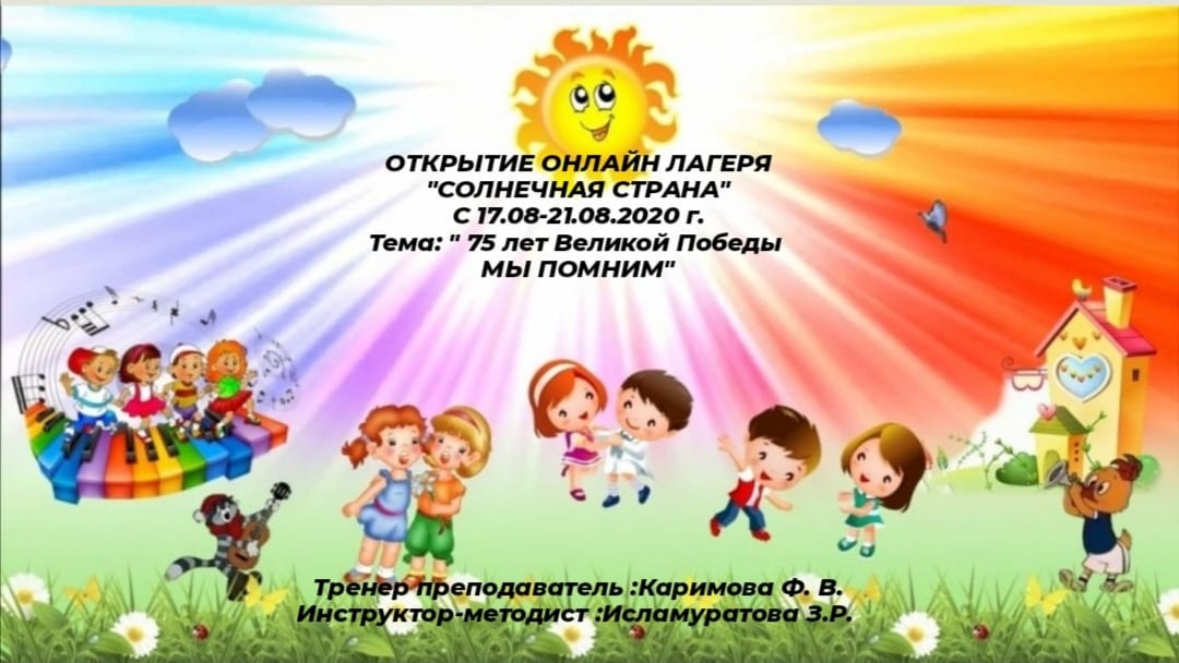 17 августа 2020г. началась 5 смена онлайн-лагеря ДЮСШ с. Раевский «Солнечная страна». Открытие онлайн-смены посвящённая «75 лет Великой Победы» провела тренер-преподаватель по фитнес - айробике Каримова Фидания Вителиевна