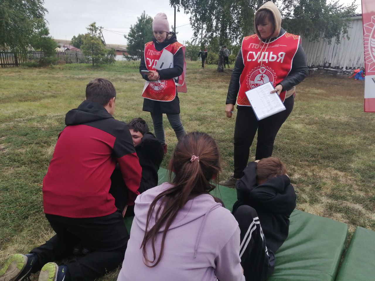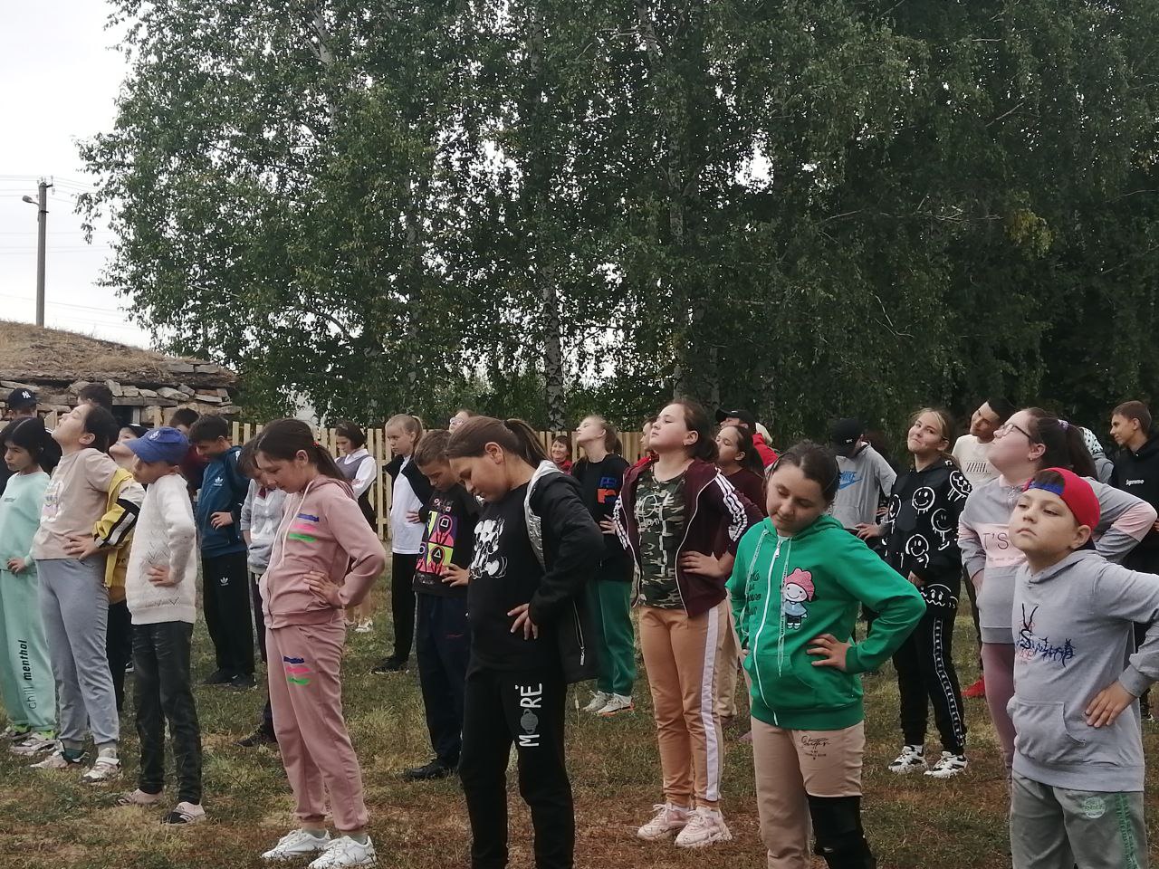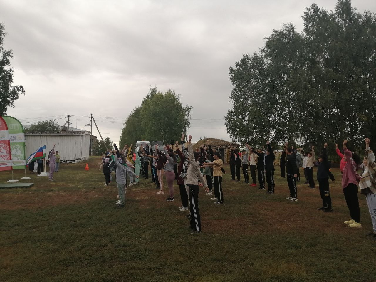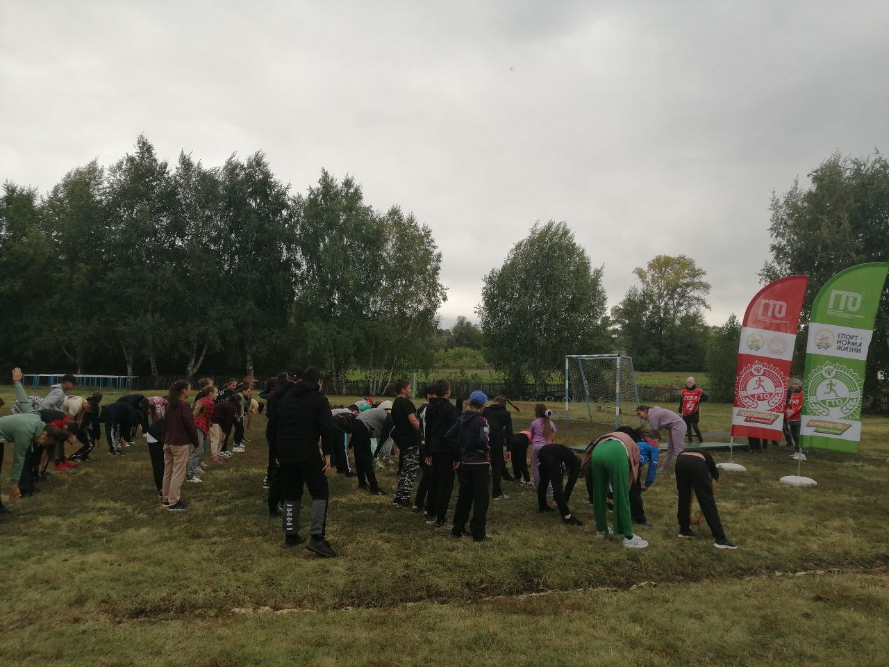 Перед выполнением нормативов ВФСК ГТО с участниками учитель физической культуры МБОУ СОШ с. Трунтаишево провела разминку - зарядку.