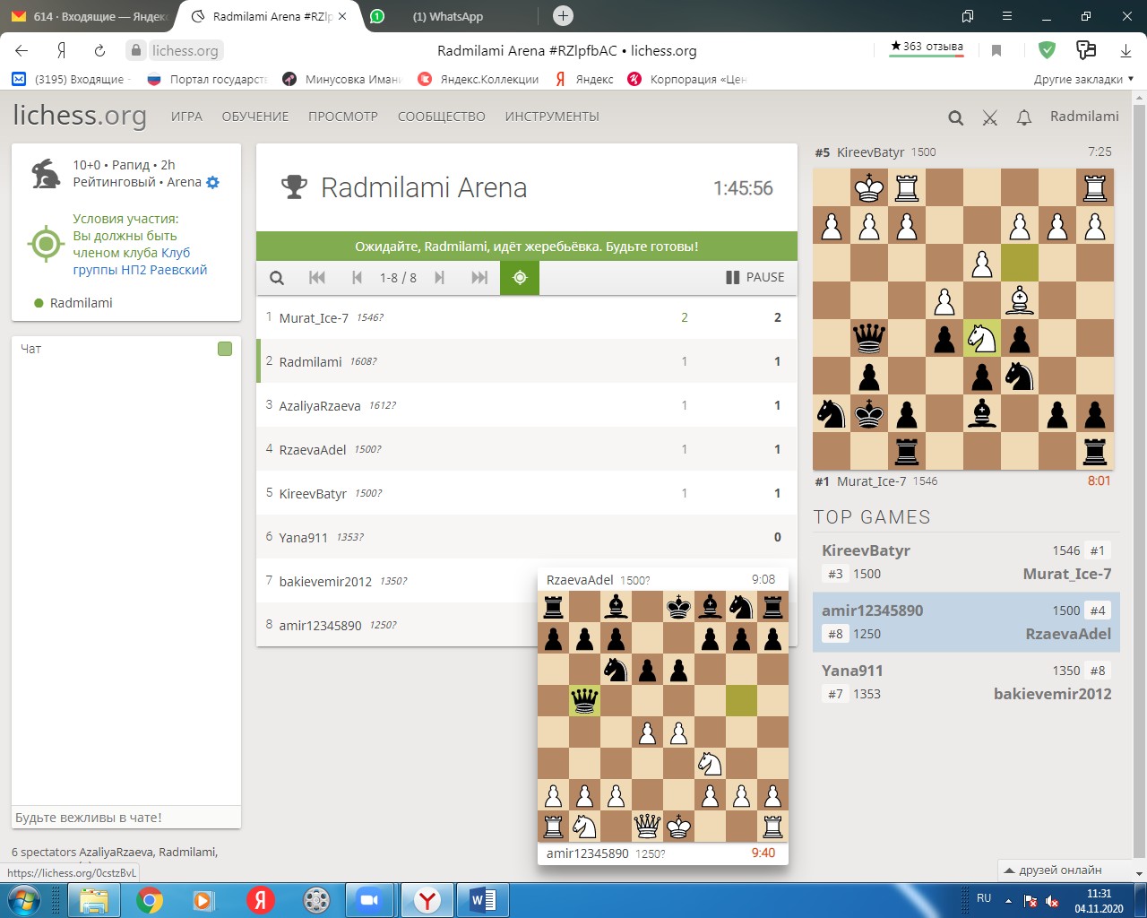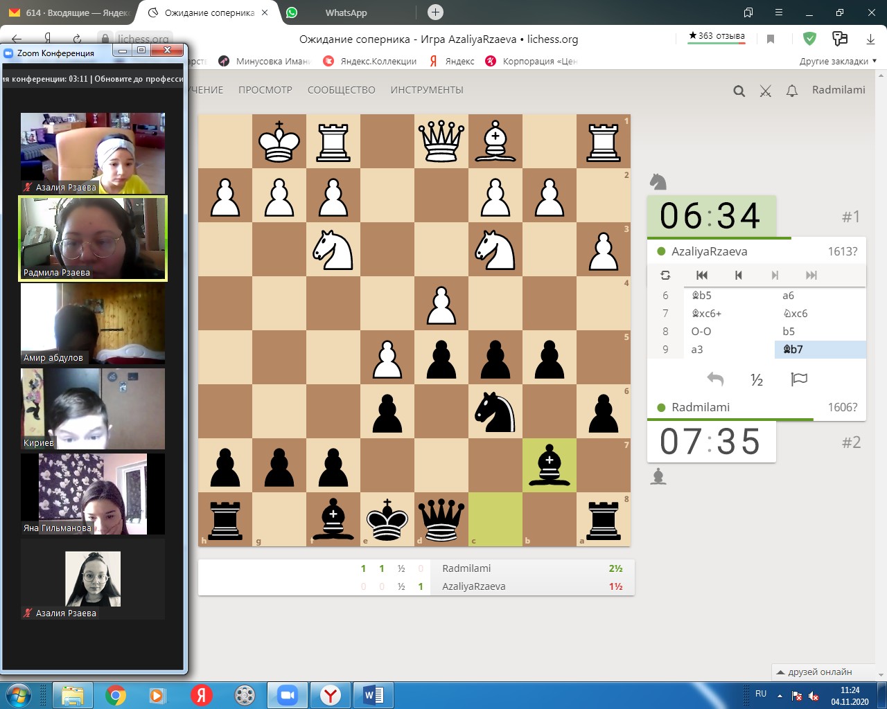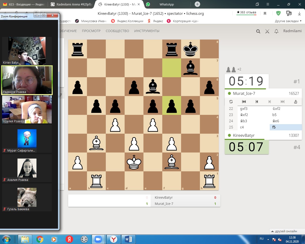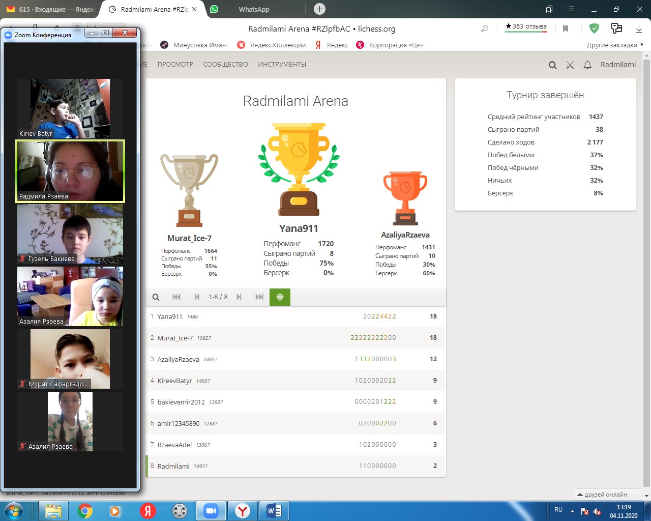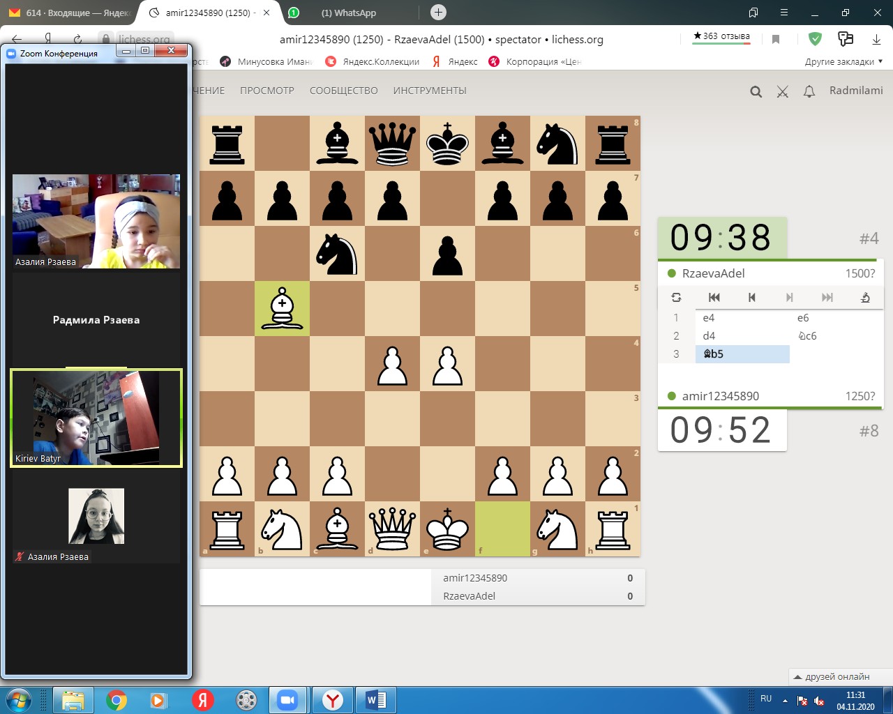 04 ноября 2020 года прошел on-line турнир по шахматам, посвященный "Дню народного единства". В турнире было сыграно более 38 партий, сделано более 2150 ходов, приняло участие 7 воспитанников ДЮСШ с. Раевский. С приветственными словами и поздравлениями выступил директор МБУДО ДЮСШ с.Раевский Артур Раисович Шарипов. А также ребят поздравил председатель комитета по спорту и молодежной политике Динар Маратович Ахмадрисламов, пожелав ребятам успехов, честной борьбы и здоровья. По итогам упорной борьбы Гильманова Яна заняла I место, Сафаргалиев Мурат - II место и Рзаева Азалия - III место. Поздравляем ребят!!! Желаем дальнейших успехов!